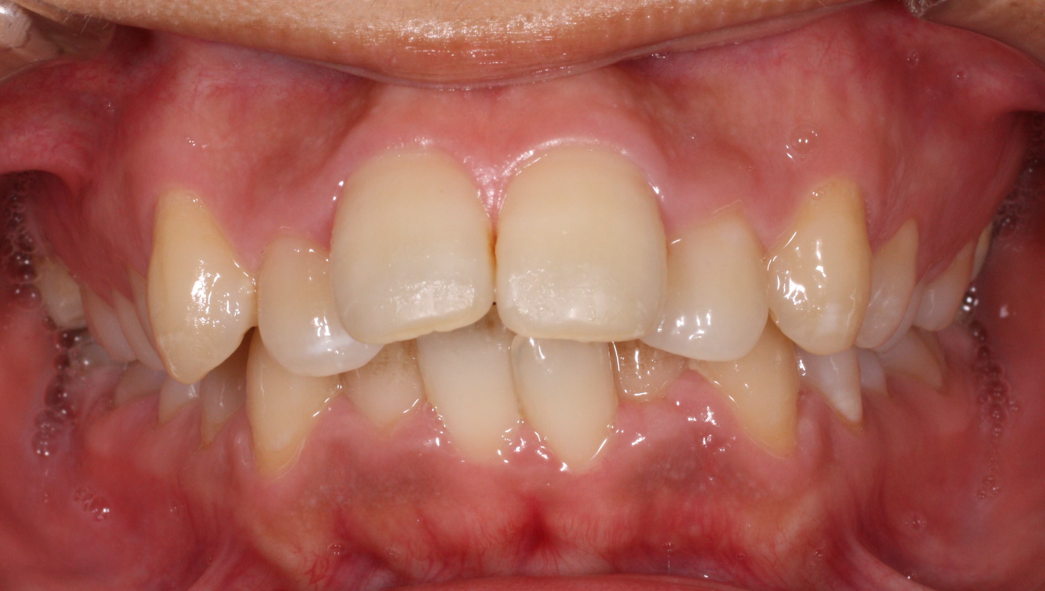 上顎前歯の叢生を気にして来院された、41歳5か月の女性です。叢生の程度が大きいため、上顎2本抜歯を併用してマルチブラケット治療を行いました。治療期間は1年6か月で、歯並び・かみ合わせとも良好に改善しました。